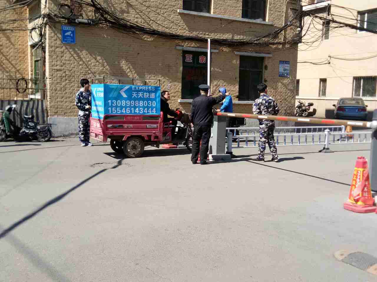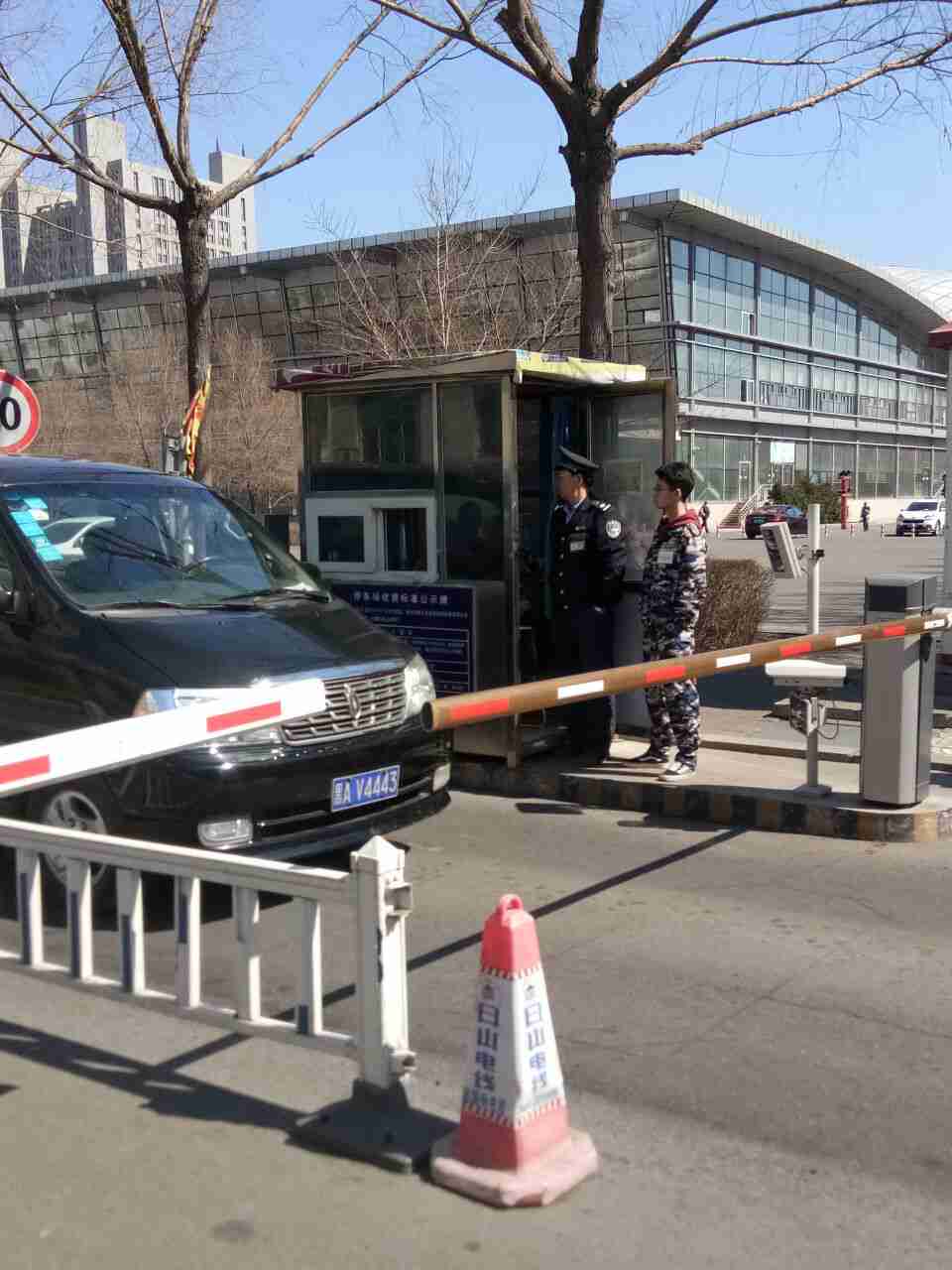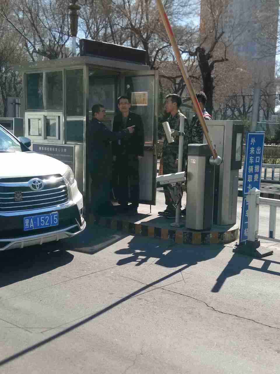 看,西区南门的实践体验小分队成员和保卫工作人员一起检查过往车辆