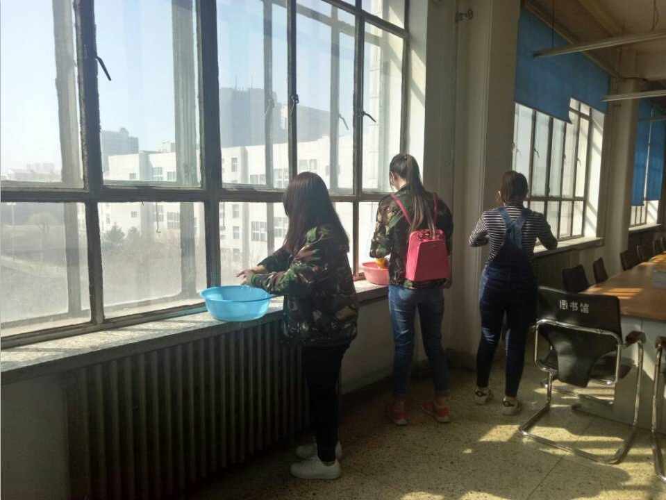 看,同学们在认真的打扫图书馆