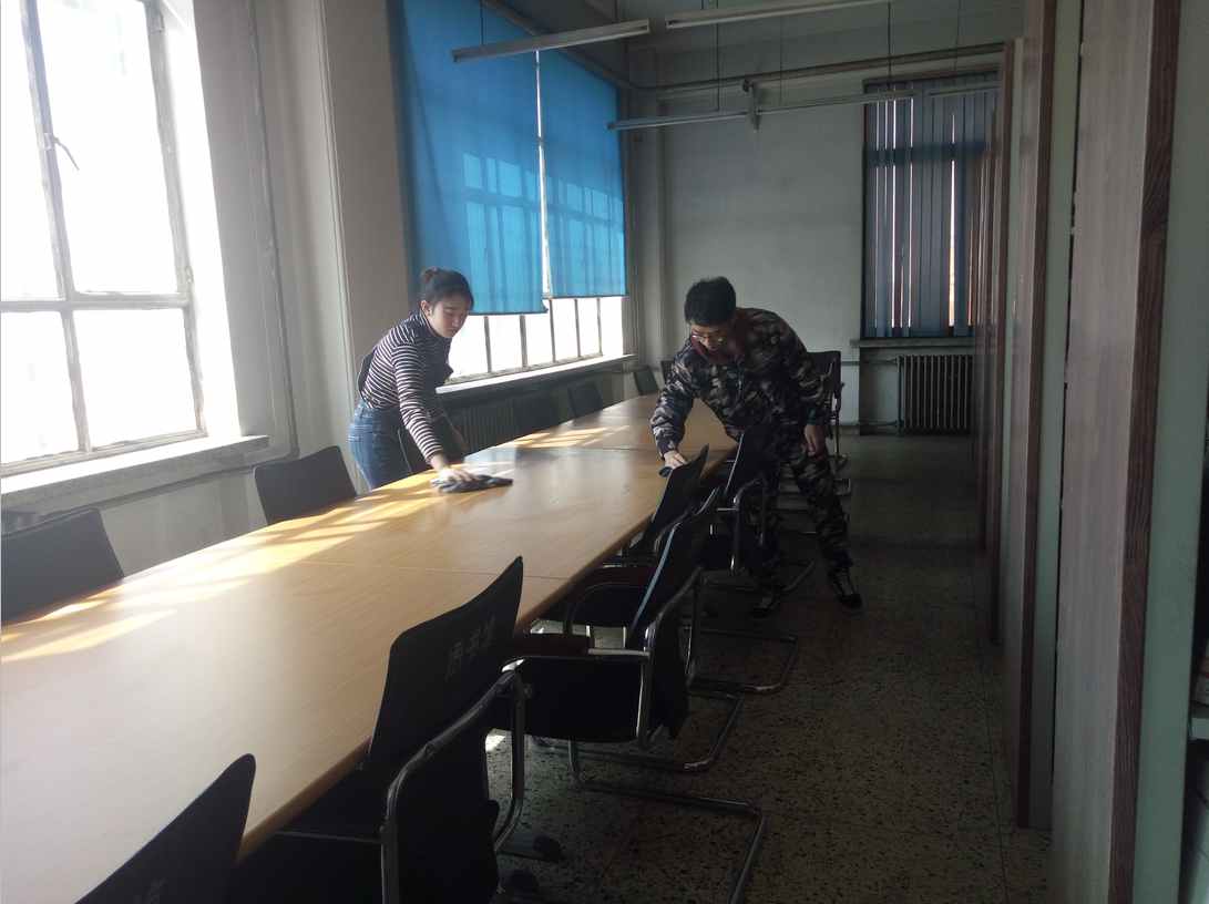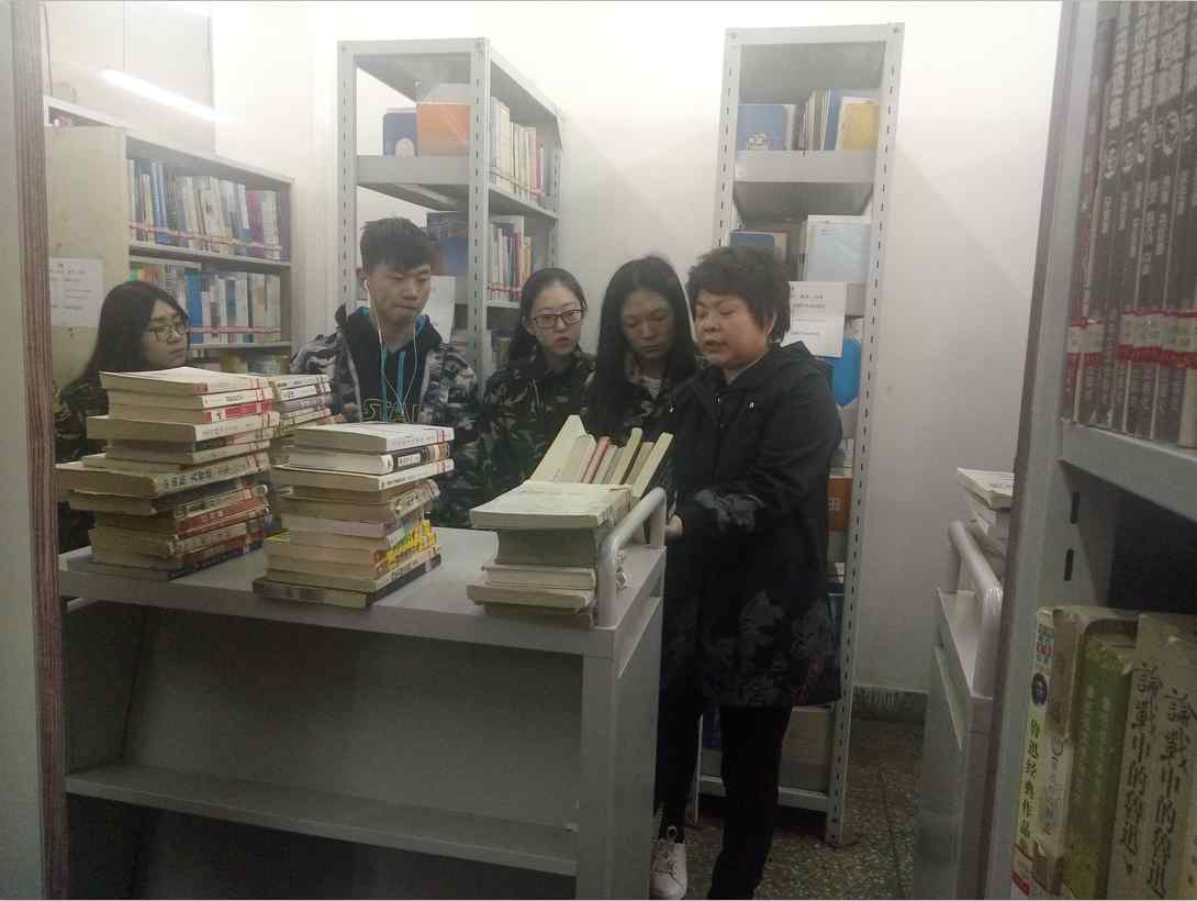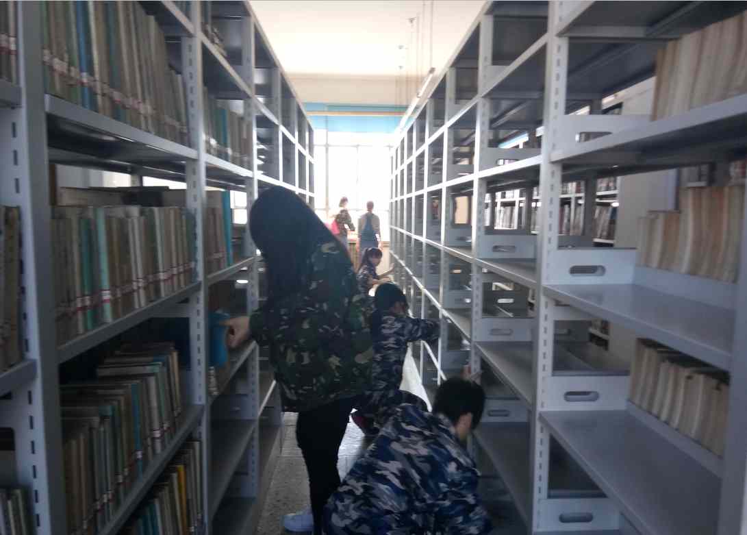 随后,他们一行来到四楼的藏书室,工作任务是将架子上的灰擦干净,再将书摆齐。工作中见证了:“所有的事情做起来都比看起来复杂”。四楼书架上的书也比一楼的更大更厚,且书架里面的灰尘很多,劳动的时候满屋灰尘,但是同学们仍然斗志满满,坚持把自己的工作任务完成。