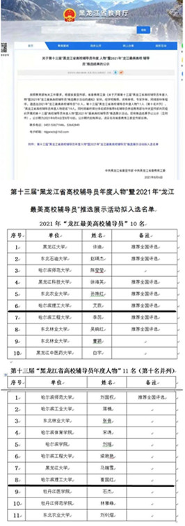 近日,由黑龙江省委宣传部、省委教育工委主办的第十三届“黑龙江省高校辅导员年度人物”暨2021年“龙江最美高校辅导员”评选活动结果揭晓,我校自动化学院党委副书记艾荻获得2021年“龙江最美高校辅导员”荣誉称号,并作为黑龙江省辅导员代表参加教育部与中央宣传部共同组织的第十三届“全国高校辅导员年度人物”暨2021年“最美高校辅导员”评选活动;机械动力工程学院辅导员崔国红获得第十三届“黑龙江省高校辅导员年度人物”荣誉称号。这是我校辅导员首次被推荐参加全国“最美高校辅导员”评比,是我校在辅导员队伍建设和发展过程中取得的又一重要成果。
