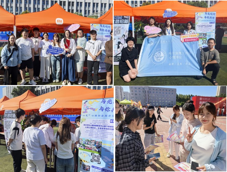 校心协成员通过海报展板、往期活动照片集、现场派发迎新传单等方式吸引新生关注,现场报名踊跃,百团大战活动同步进行中。心理协会成员展示着新设计的纳新手册,热情的介绍心苑心理协会,迎接更多热爱心理学、擅长创意策划或是乐于实践的行动者的加入。