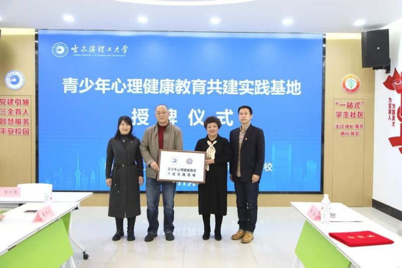 仪式最后,我校党委学生工作部副部长田海燕大学生心理健康教育中心主任吕彬江向哈尔滨市清滨小学校长徐孟、副校长刘军授牌 “青少年心理健康教育共建实践基地”,标志着双方合作正式落地。在签约仪式结束后,哈尔滨市清滨小学校一行参观我校心理健康教育中心。