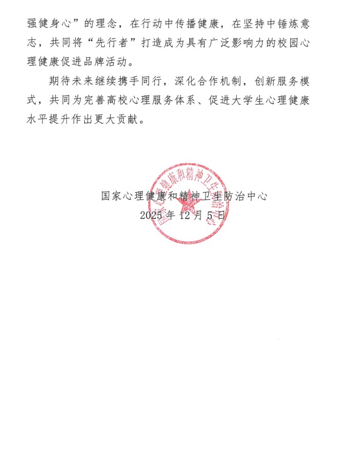 近日,我校收到国家心理健康和精神卫生防治中心发来的感谢信,信中对我校在第四届“先行者心理健康校园行”活动中的卓越表现给予高度赞誉,这是国家主管部门对我校心理健康教育工作的充分肯定,更是全体师生共同努力的丰硕成果!