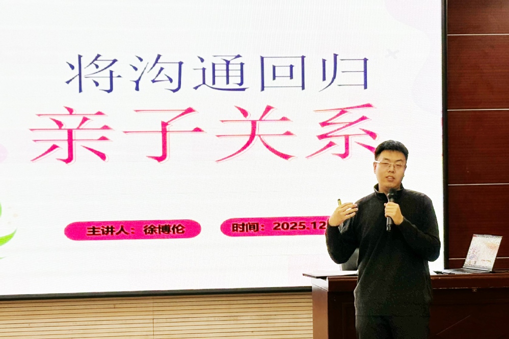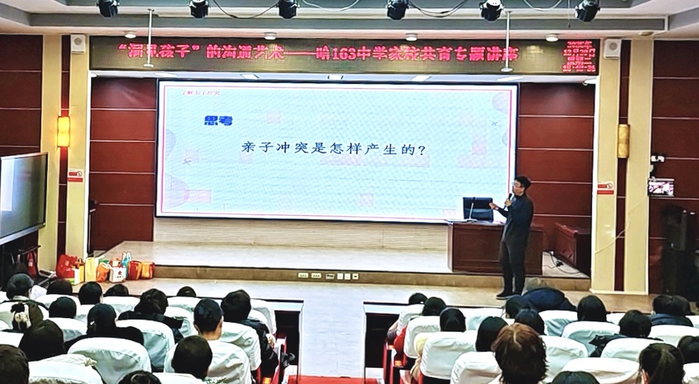 为深入践行高校社会服务职能,推动优质心理健康教育资源向基础教育延伸,2025年12月30日,哈尔滨理工大学心理专职教师徐博伦受邀走进哈尔滨市第一六三中学,联合该校心理教师李燚,共同开展“家校共育·心向未来”亲子沟通专题讲座。本次活动由双方协同策划、优势互补,通过“理论讲授+沉浸体验”双轨并进的方式,为现场及线上数百名学生家长带来一场兼具专业深度与实践温度的家庭教育讲座。