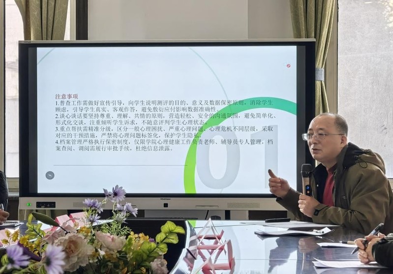 心理健康中心韩雨希老师则聚焦心理测评工作,从测评流程规范、数据解读方法、结果应用及隐私保护等方面进行系统讲解,强调心理测评是精准掌握学生心理状态、开展针对性心理服务的重要前提,要求各学院严格按照标准开展测评工作,做好数据整理分析与后续跟踪服务,充分发挥测评的预警与导向作用。