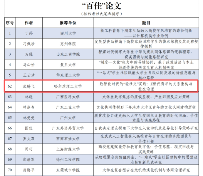 近日,教育部高校思想政治工作队伍培训研修中心(山东大学)、《高校辅导员》编辑部公布了2025年高校思想政治工作优秀文章征集活动评选结果。我校自动化学院辅导员武腾飞撰写的论文《数智化时代的“轻社交”实践:Z世代青年的关系重构与社交治理》获评“百佳”论文
