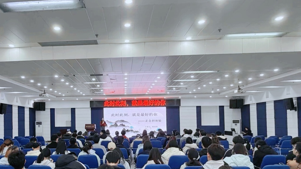为深入推进5·25心理健康活动月“五育润心,逐光而行”系列活动,落实“智育启慧,解锁心密码”心理育人目标,4月16日下午,由大学生心理健康教育中心主办的“正念初体验”主题讲座在西区一号楼多功能厅顺利举行。本次讲座以“此时此刻,就是最好的你”为主题,由心理健康教育中心韩佳怡老师主讲,吸引了近二百名学生参与,现场气氛轻松而专注。